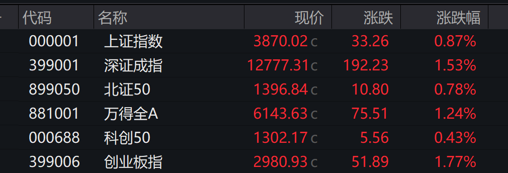 A股:截至收盘,沪指涨0.87%,深成指涨1.53%,创业板指涨1.77%。