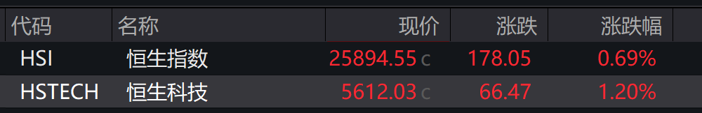 港股:截至发稿,恒指涨0.69%,恒生科技指数涨1.2%。