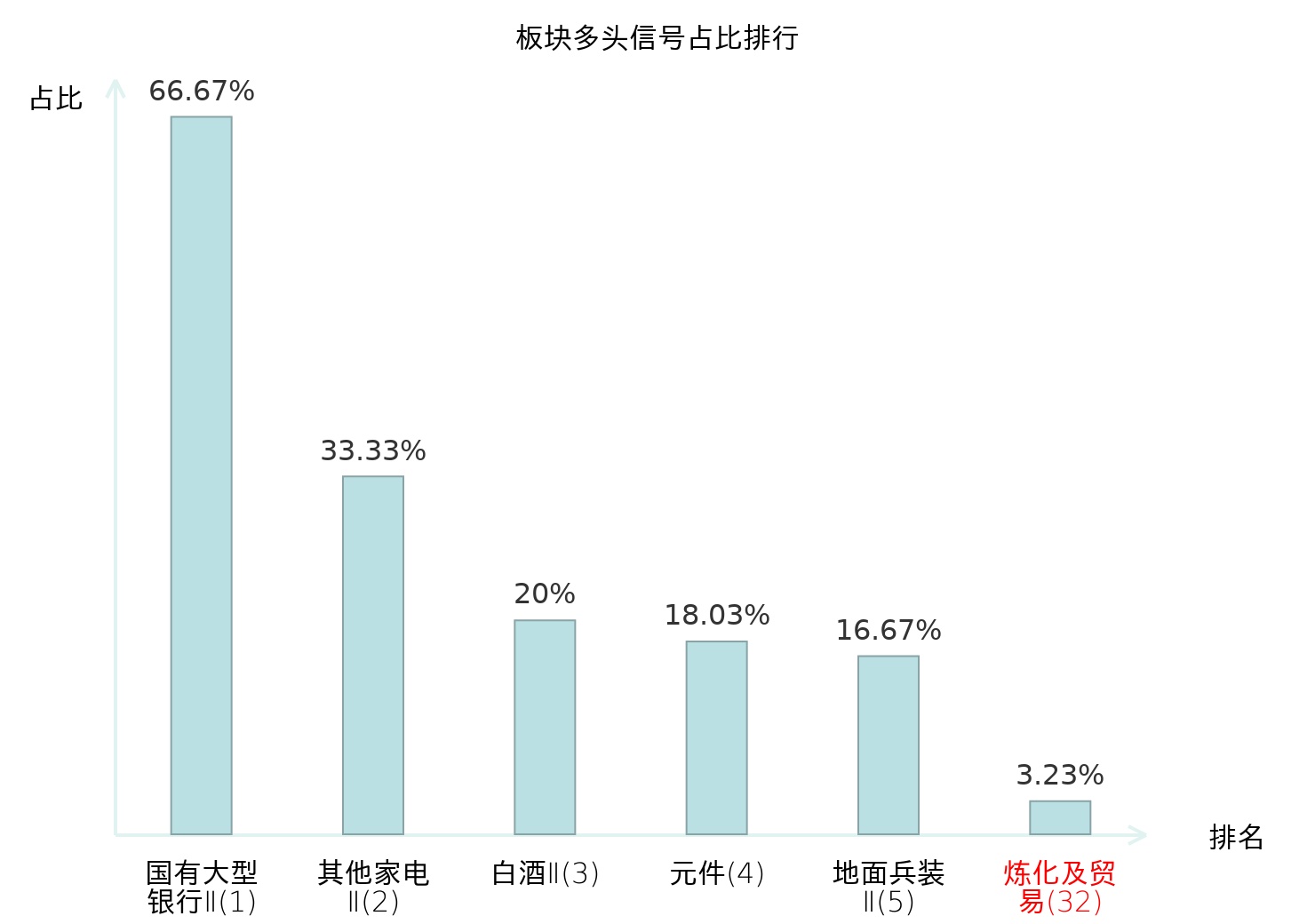全市场所有行业板块中主力多头信号占比排名中,国有大型银行Ⅱ板块位居第一。其他家电Ⅱ板块名次提升最快,较昨日上升127位。