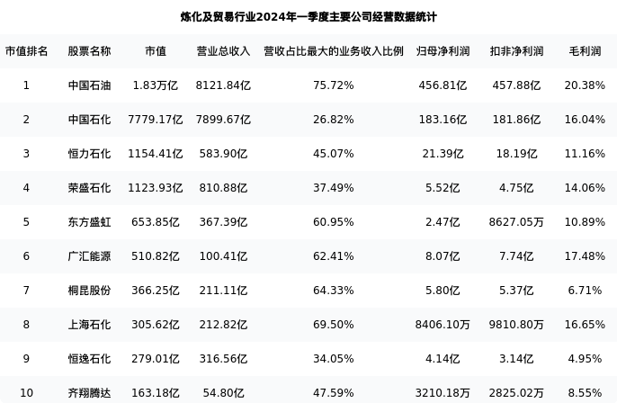 恒逸石化最新报告期数据为一季度,下表汇总了炼化及贸易行业内市值靠前的公司一季度主要经营数据
