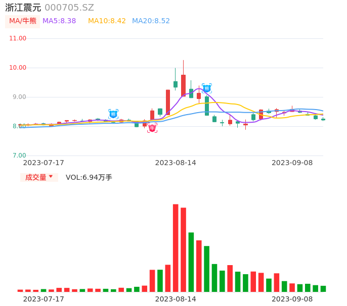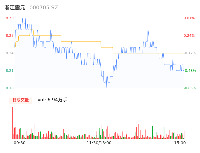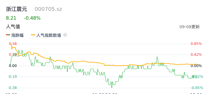 09月08日,浙江震元收报8.21,股价涨幅-0.48%,成交金额5722.14万元,换手率2.46%。