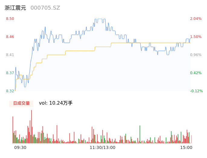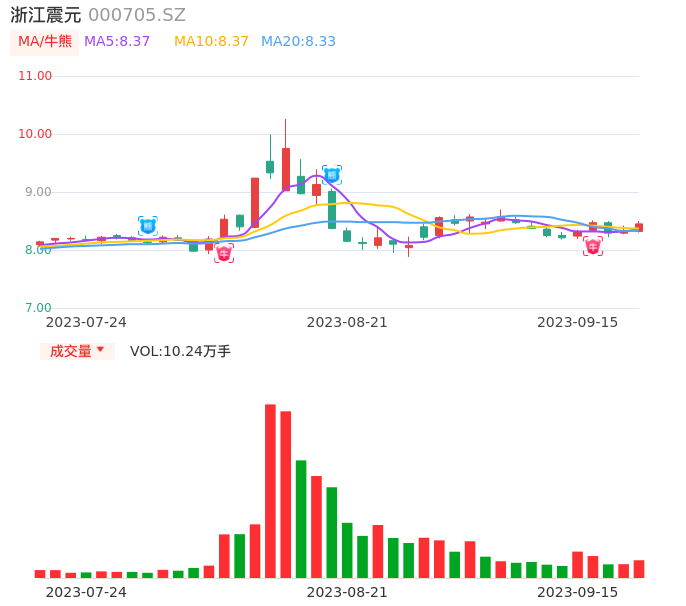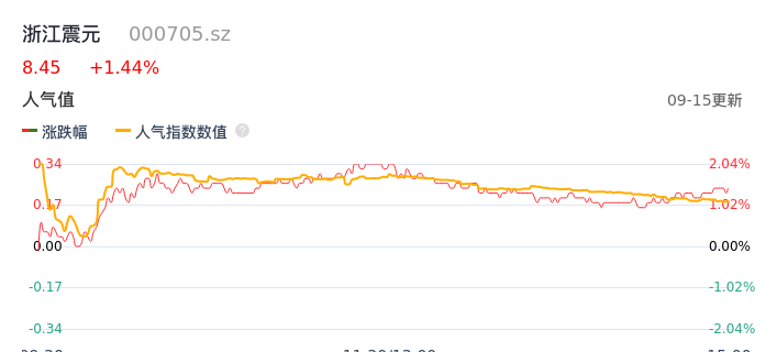 09月15日,浙江震元收报8.45,股价涨幅1.44%,成交金额8636.19万元,换手率3.63%。