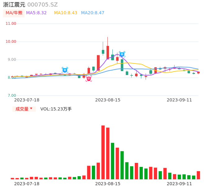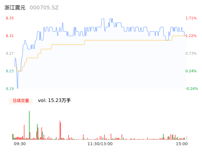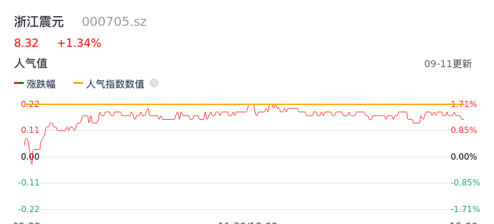 09月11日,浙江震元收报8.32,股价涨幅1.34%,成交金额1.27亿元,换手率5.40%。