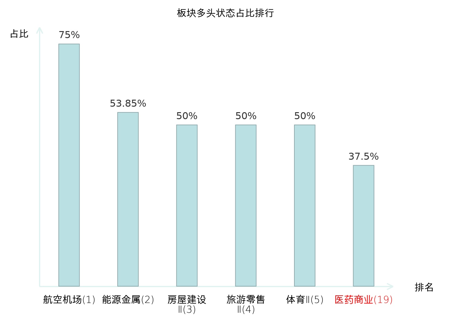 全市场所有行业板块中主力多头状态占比排名中,航空机场板块位居第一。其他电子Ⅱ板块名次提升最快,较昨日上升53位。