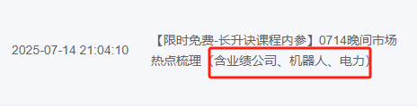 7月14号,周一,业绩和机器人次日有表现,电力有些小分化,但整体还是有涨幅,机器人方向不知道选什么的,去找原文章看一下↑最近机器人还是很强