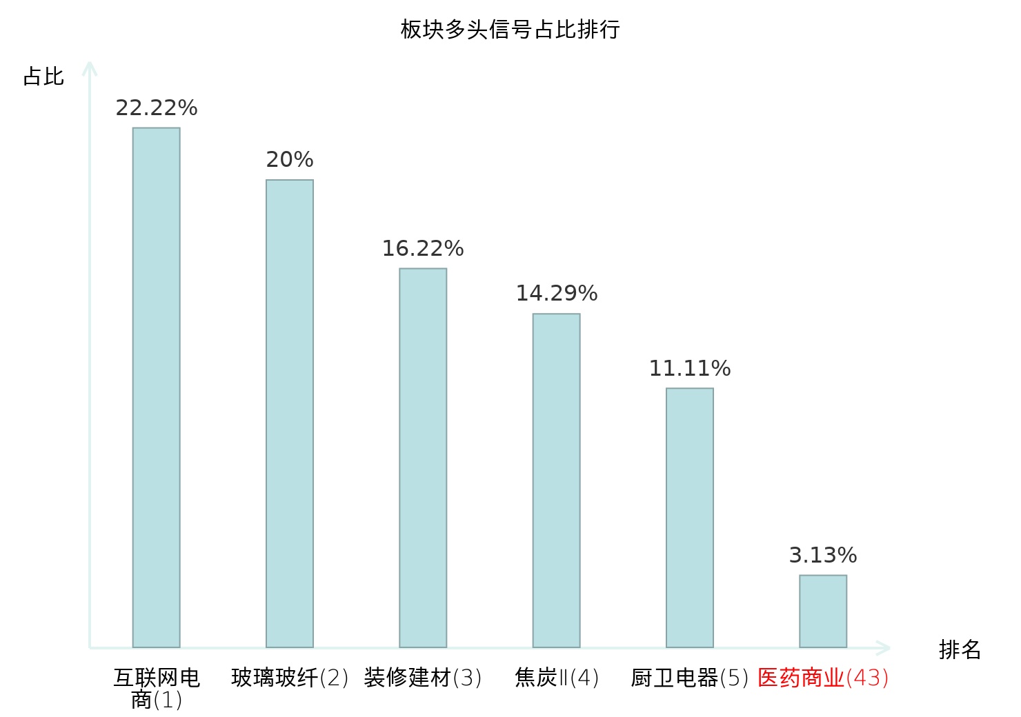 全市场所有行业板块中主力多头信号占比排名中,互联网电商板块位居第一。焦炭Ⅱ板块名次提升最快,较昨日上升118位。