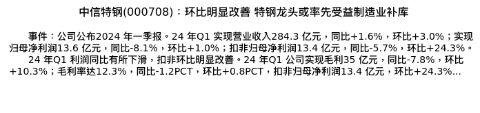 值得注意的是:2024年04月东方证券的刘洋/李一冉分析师,首次发布关于中信特钢的研究报告,标题为:中信特钢(000708):环比明显改善 特钢龙头或率先受益制造业补库。