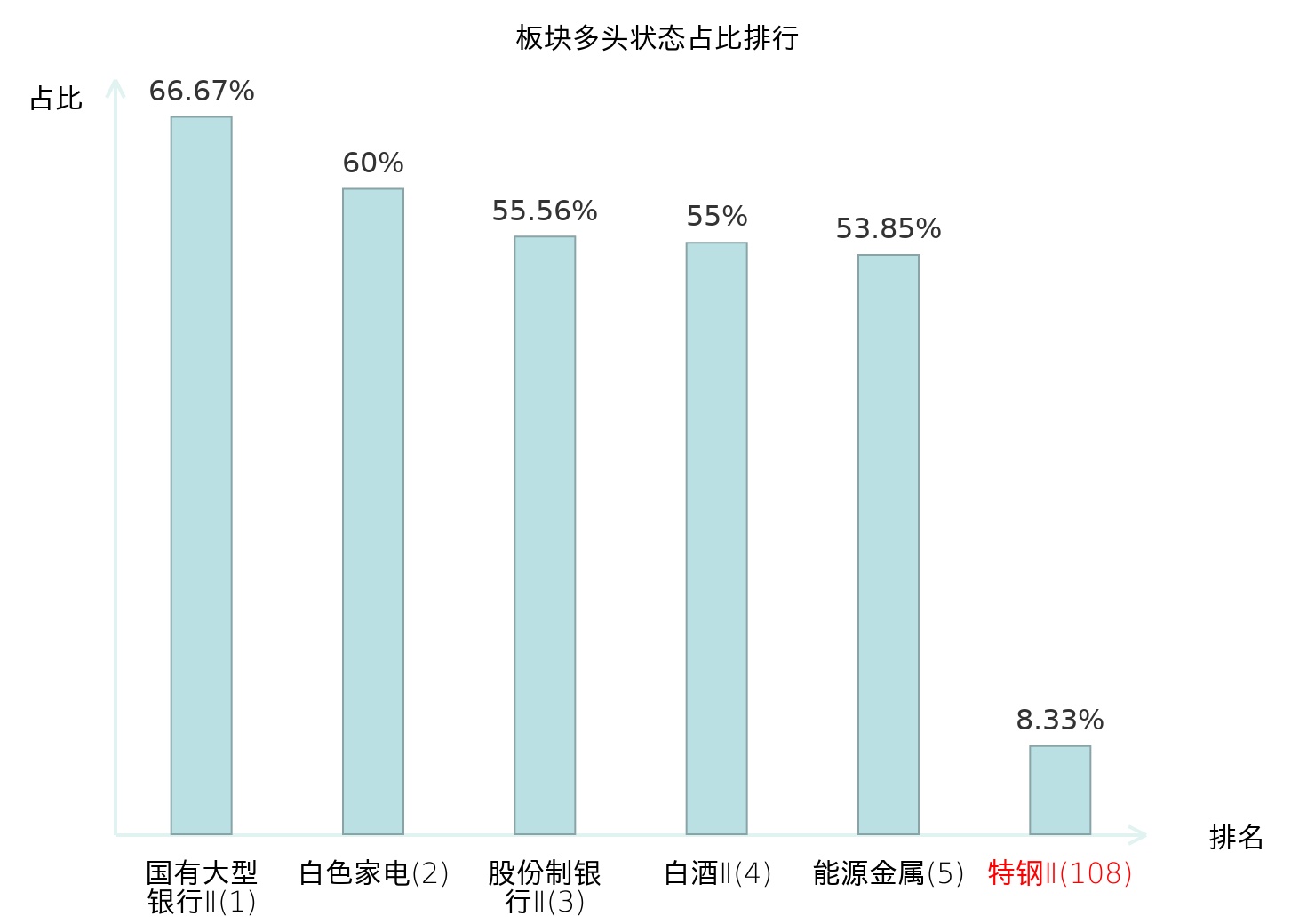 全市场所有行业板块中主力多头状态占比排名中,国有大型银行Ⅱ板块位居第一。林业Ⅱ板块名次提升最快,较昨日上升99位。