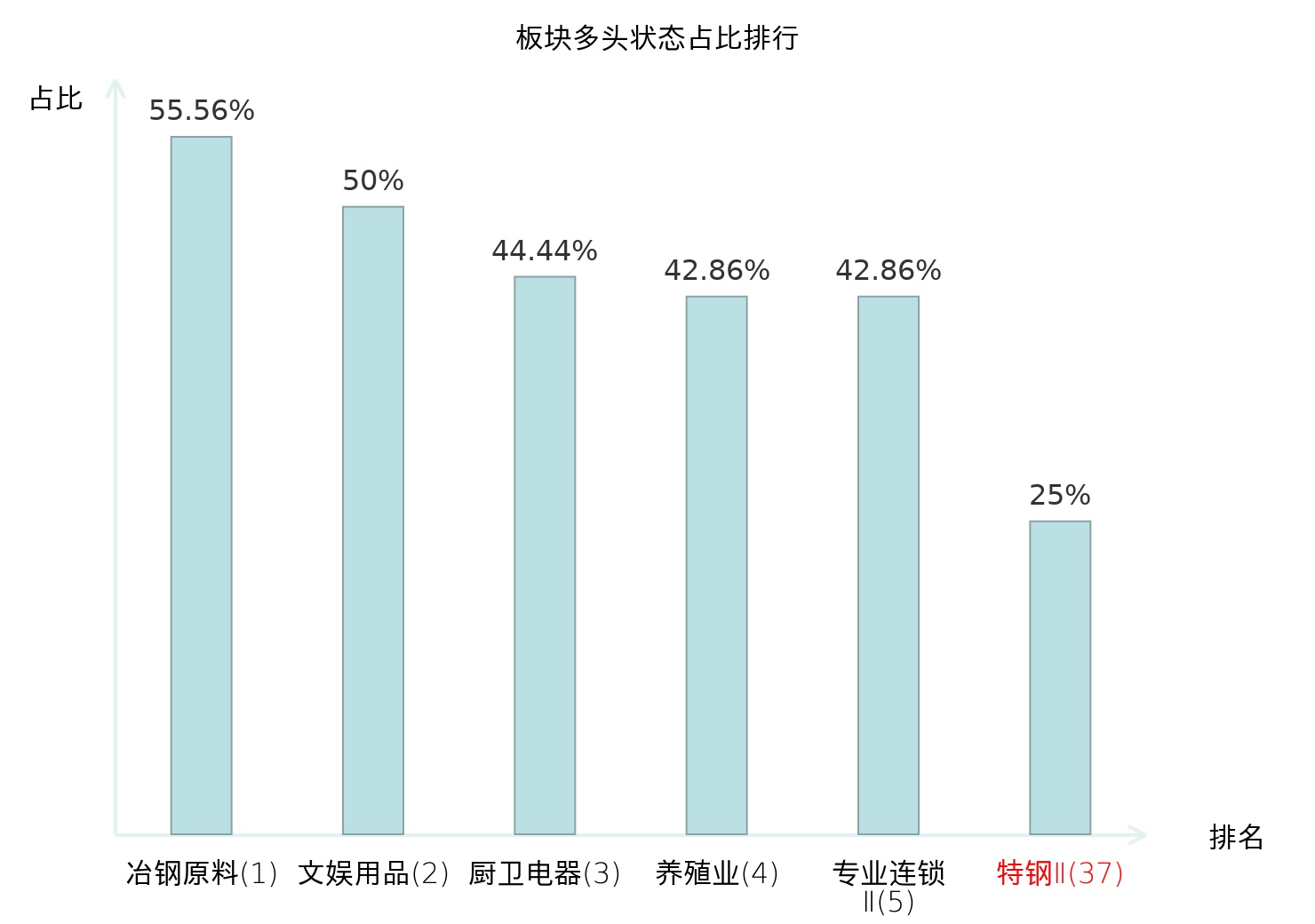 全市场所有行业板块中主力多头状态占比排名中,冶钢原料板块位居第一。能源金属板块名次提升最快,较昨日上升48位。