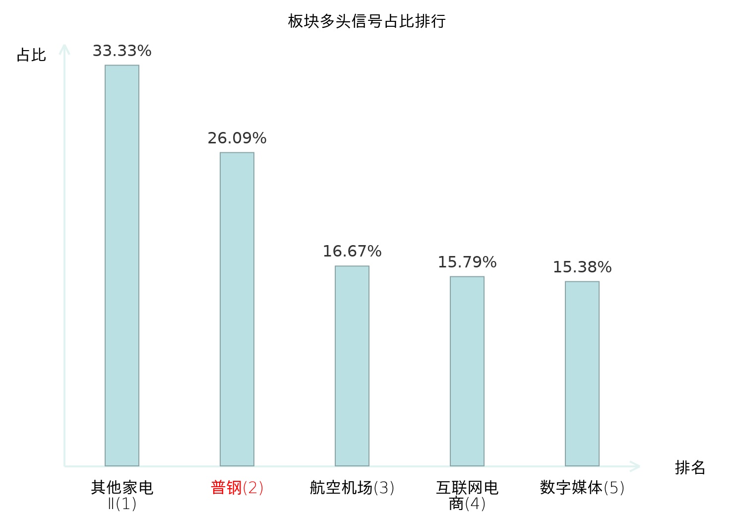 全市场所有行业板块中主力多头信号占比排名中,其他家电Ⅱ板块位居第一。其他家电Ⅱ板块名次提升最快,较昨日上升129位。