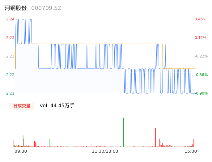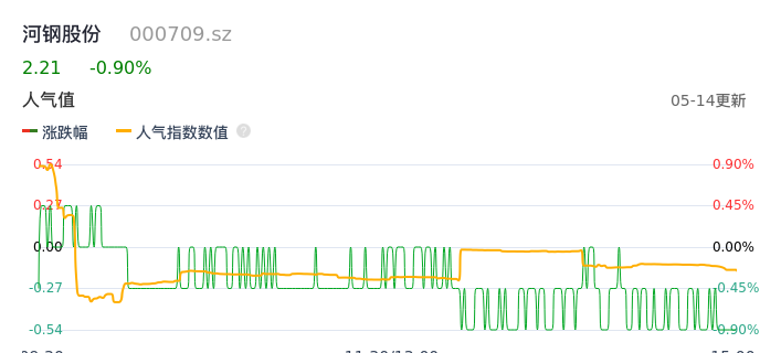 05月14日,河钢股份收报2.21,股价涨幅-0.90%,成交金额9879.00万元,换手率0.43%。