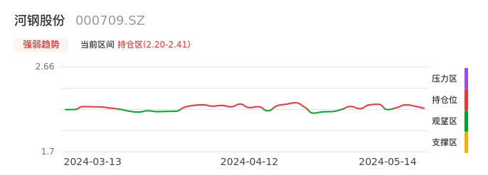 我们来看一下该股的九方特色指标强弱趋势的情况:河钢股份自05月09日从观望区上穿到持仓区。股价近期在多头区域回调整理。后续重点关注多空分界点的争夺:2.20元。如未能有效站稳则可能重新回到空头行情。
