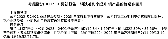 值得注意的是:2024年05月国泰君安的李鹏飞/魏雨迪/王宏玉分析师,首次发布关于河钢股份的研究报告,标题为:河钢股份(000709)更新报告:钢铁毛利率提升 钒产品价格逐步回升。