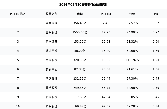 从估值角度看:河钢股份最新市盈率PETTM为23.44,在行业内排名7/23,处于57.30分位。