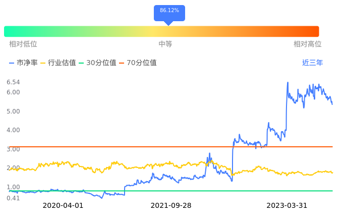 京蓝科技当前市净率PB为5.37,在所属的环境治理中,市净率PB排93,前五名分别为中山公用市净率0.68、碧水源市净率0.70、启迪环境市净率0.70、维尔利市净率0.76、武汉控股市净率0.85。京蓝科技当前市净率PB为5.37,超过近3年86.12%的历史数据。