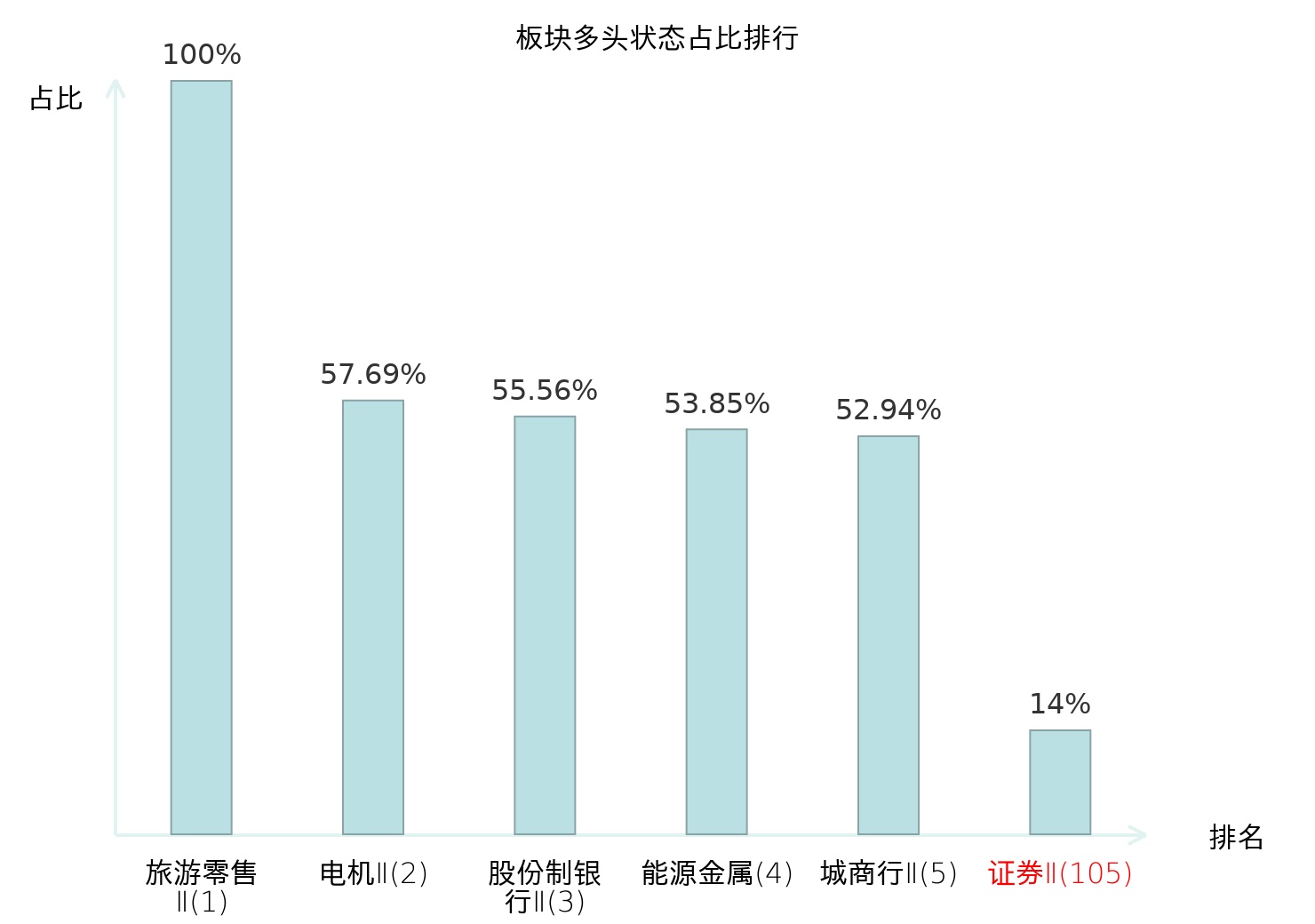全市场所有行业板块中主力多头状态占比排名中,旅游零售Ⅱ板块位居第一。地面兵装Ⅱ板块名次提升最快,较昨日上升99位。