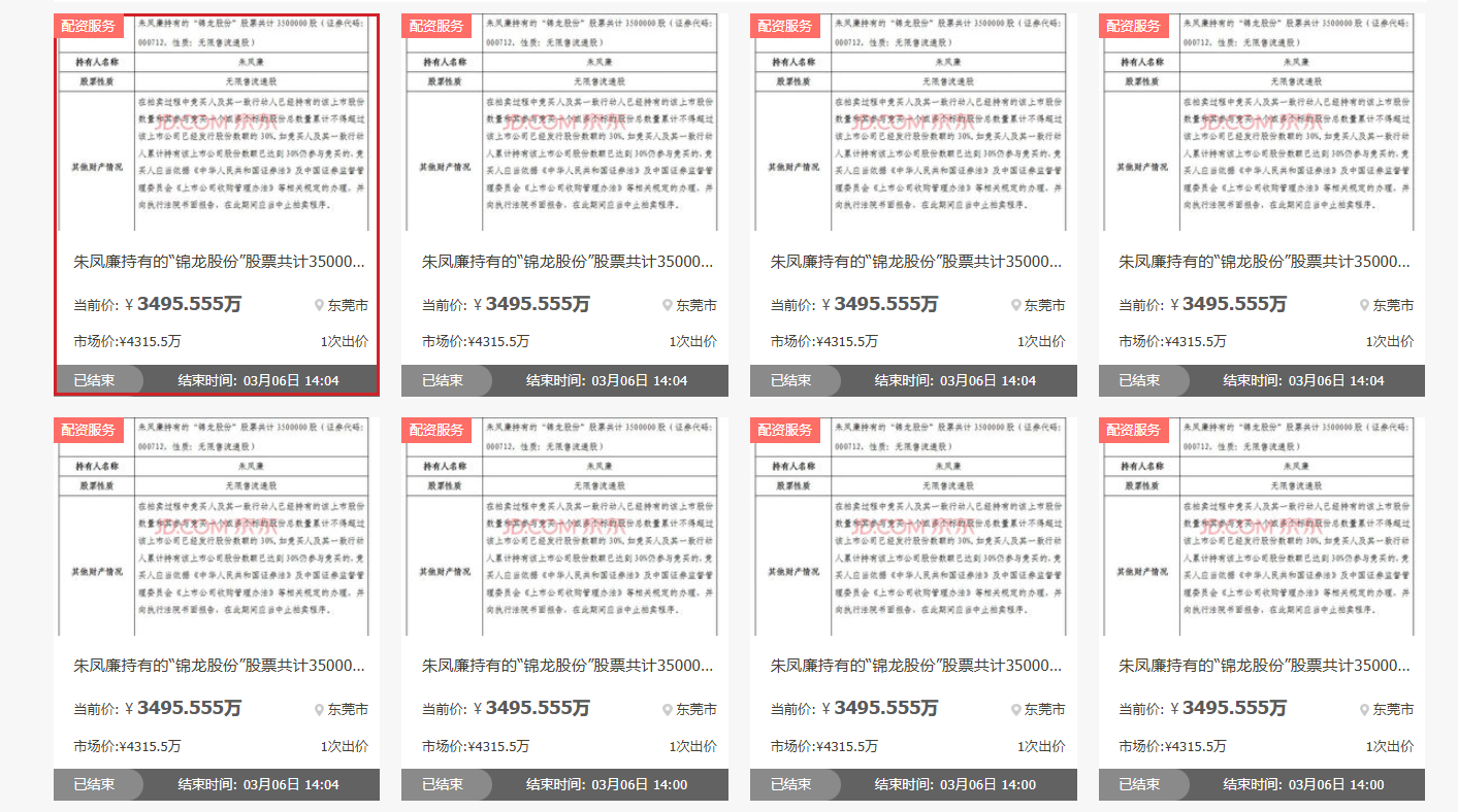 上证报中国证券网讯3月6日,锦龙股份实控人杨志茂之妻朱凤廉持有的6300万股锦龙股份在京东司法拍卖平台结束第二次司法拍卖。本次拍卖共分为18个标的,每个标的对应350万股,起拍价均为3495.555万元,约合9.99元/股。最终15个标的成功拍出,合计成交5250万股,剩余3个标的流拍。