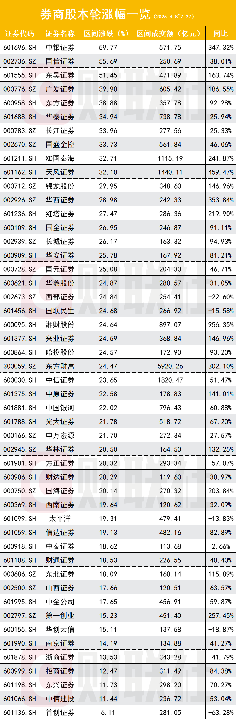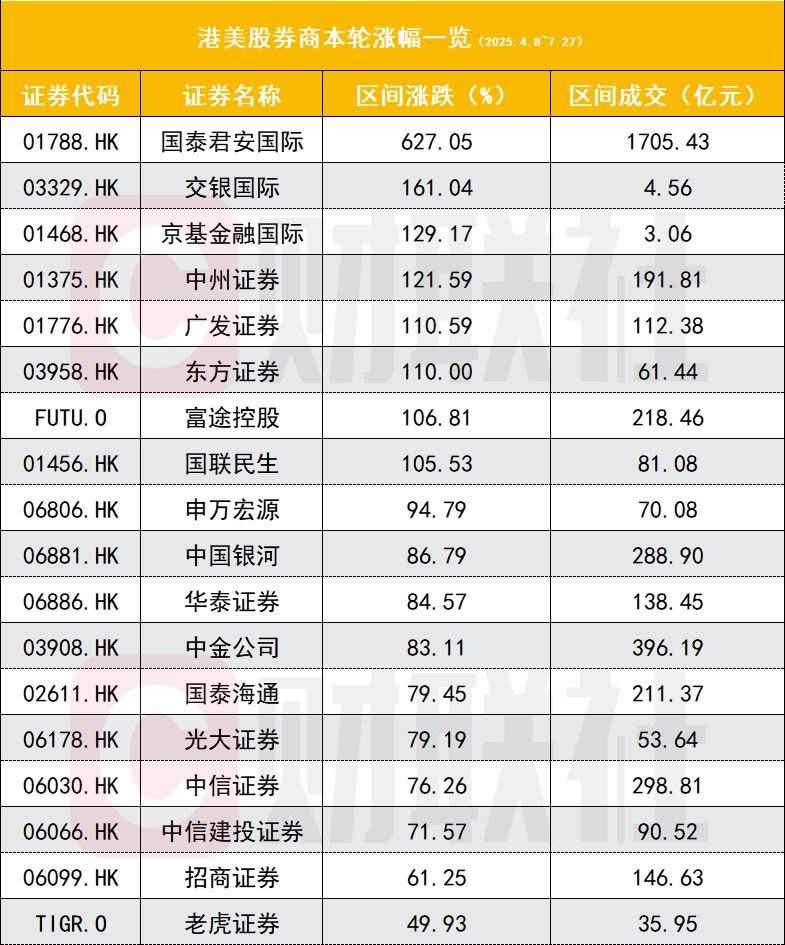其他涨幅较大的个股为广发证券(39.9%)、东方证券(38.88%)、华泰证券(34.94%)、长江证券(33.96%)、国盛金控(33.73%)、国泰海通(32.71%)、天风证券(32.1%)、锦龙股份(29.95%)、华西证券(28.98%)。