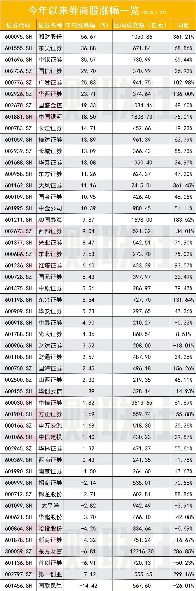 以截至7月27日数据来看,4月以来,49只券商股中33只涨幅超过两成,其中11只券商股涨幅超过三成,中银证券、国信证券、东吴证券上涨幅度超过五成,分别上涨59.77%、55.69%、51.45%。
