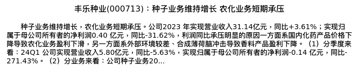 值得注意的是:2024年05月国信证券的鲁家瑞/李瑞楠分析师,首次发布关于丰乐种业的研究报告,标题为:丰乐种业(000713):种子业务维持增长 农化业务短期承压。