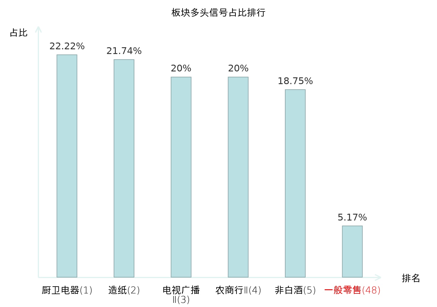 从主力宝信号数据分析,中兴商业所属的一般零售板块中共有3只股票发出主力多头信号,主力多头信号占比在全行业中排名第48位,较昨日下降27位。排名较高表明主力当日买入意愿较强,但此次排名下降可能反映了主力对该板块态度的变化。全市场所有行业板块中主力多头信号占比排名中,厨卫电器板块位居第一。厨卫电器板块名次提升最快,较昨日上升115位。这些变动揭示了不同行业间主力资金偏好的变化,为投资者提供了市场趋势的重要参考。