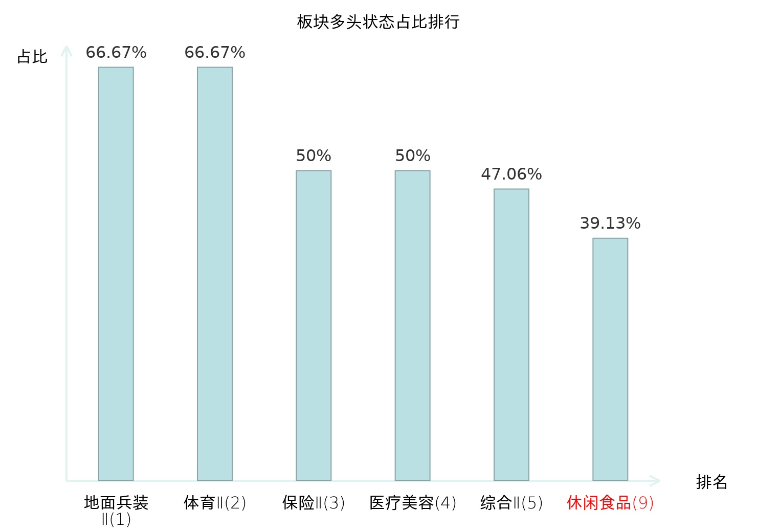 全市场所有行业板块中主力多头状态占比排名中,地面兵装Ⅱ板块位居第一。保险Ⅱ板块名次提升最快,较昨日上升82位。