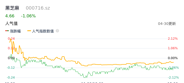 04月30日,黑芝麻收报4.66,股价涨幅-1.06%,成交金额6902.48万元,换手率2.11%。