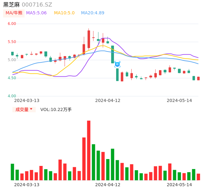 05月14日,黑芝麻收报4.53,股价涨幅2.03%,成交金额4603.62万元,换手率1.46%。