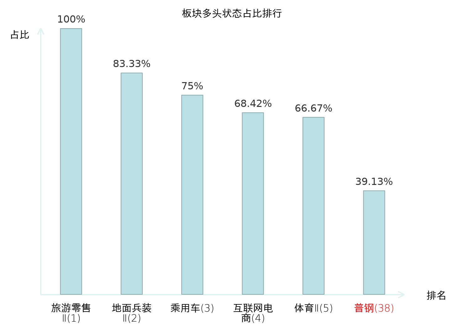 全市场所有行业板块中主力多头状态占比排名中,旅游零售Ⅱ板块位居第一。房屋建设Ⅱ板块名次提升最快,较昨日上升50位。