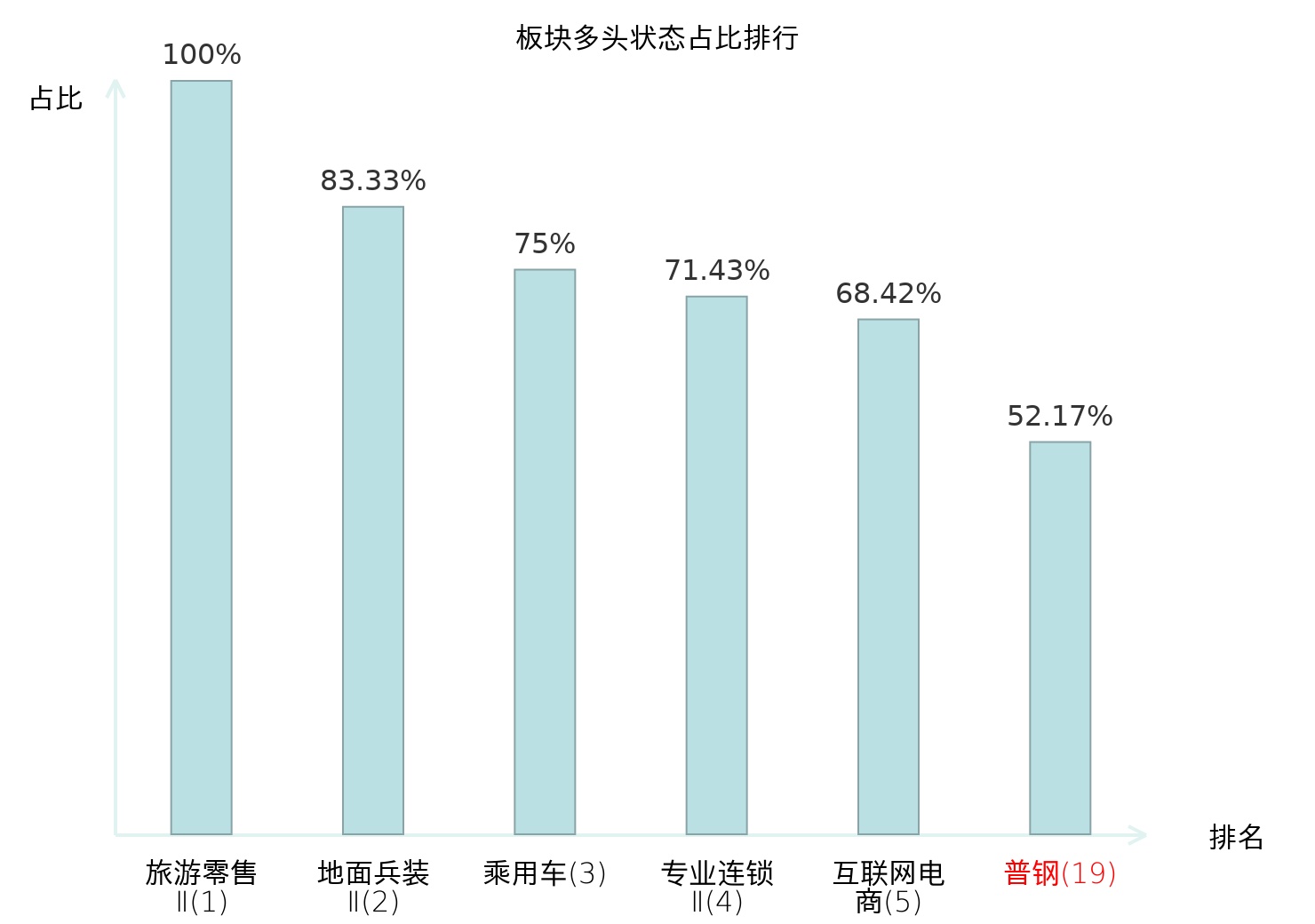 全市场所有行业板块中主力多头状态占比排名中,旅游零售Ⅱ板块位居第一。其他家电Ⅱ板块名次提升最快,较昨日上升55位。