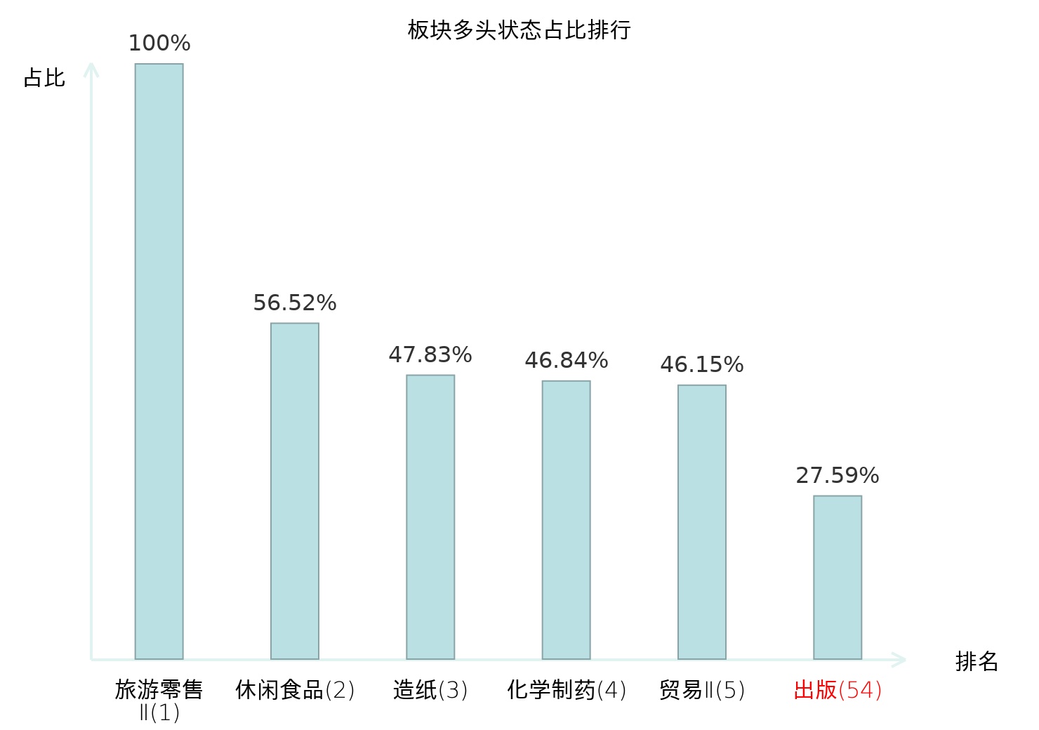全市场所有行业板块中主力多头状态占比排名中,旅游零售Ⅱ板块位居第一。动物保健Ⅱ板块名次提升最快,较昨日上升58位。