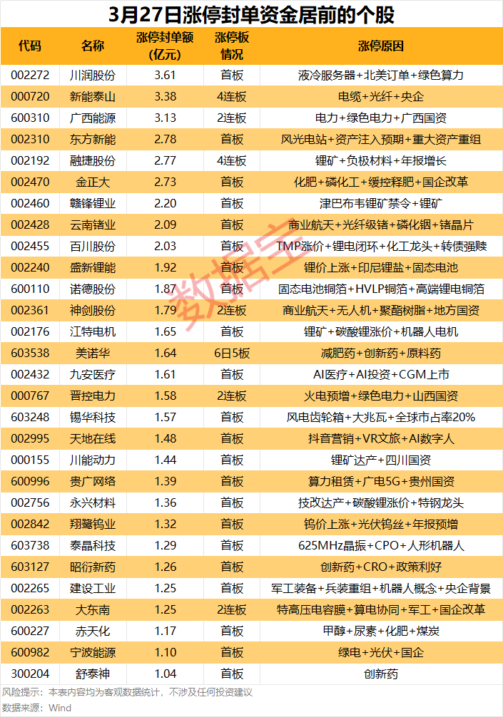 以封单金额计算,川润股份、新能泰山、广西能源涨停板封单资金居前,分别有3.61亿元、3.38亿元、3.13亿元。
