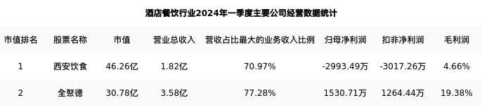 西安饮食最新报告期数据为一季度,下表汇总了酒店餐饮行业内市值靠前的公司一季度主要经营数据