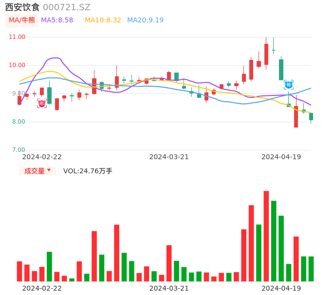 04月19日,西安饮食收报8.06,股价涨幅-3.36%,成交金额2.00亿元,换手率5.66%。