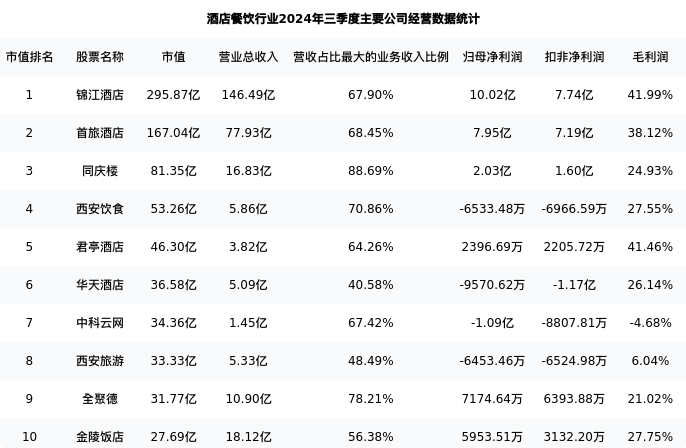 西安饮食最新报告期数据为三季度,下表汇总了酒店餐饮行业内市值靠前的公司三季度主要经营数据
