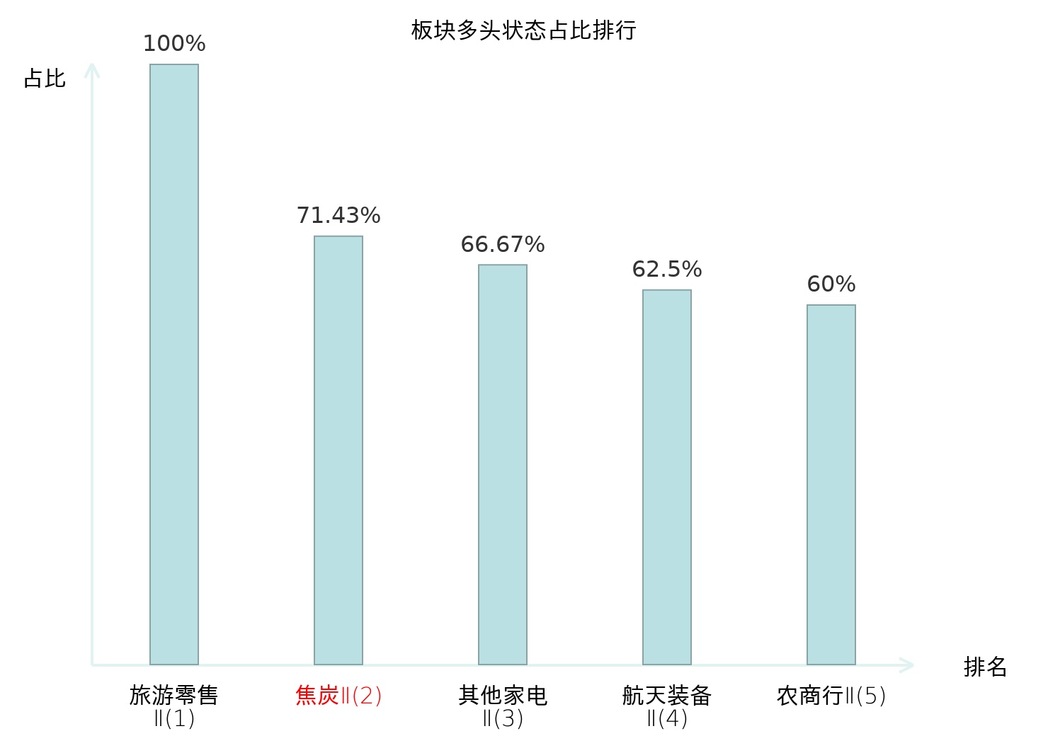 全市场所有行业板块中主力多头状态占比排名中,旅游零售Ⅱ板块位居第一。白酒Ⅱ板块名次提升最快,较昨日上升50位。