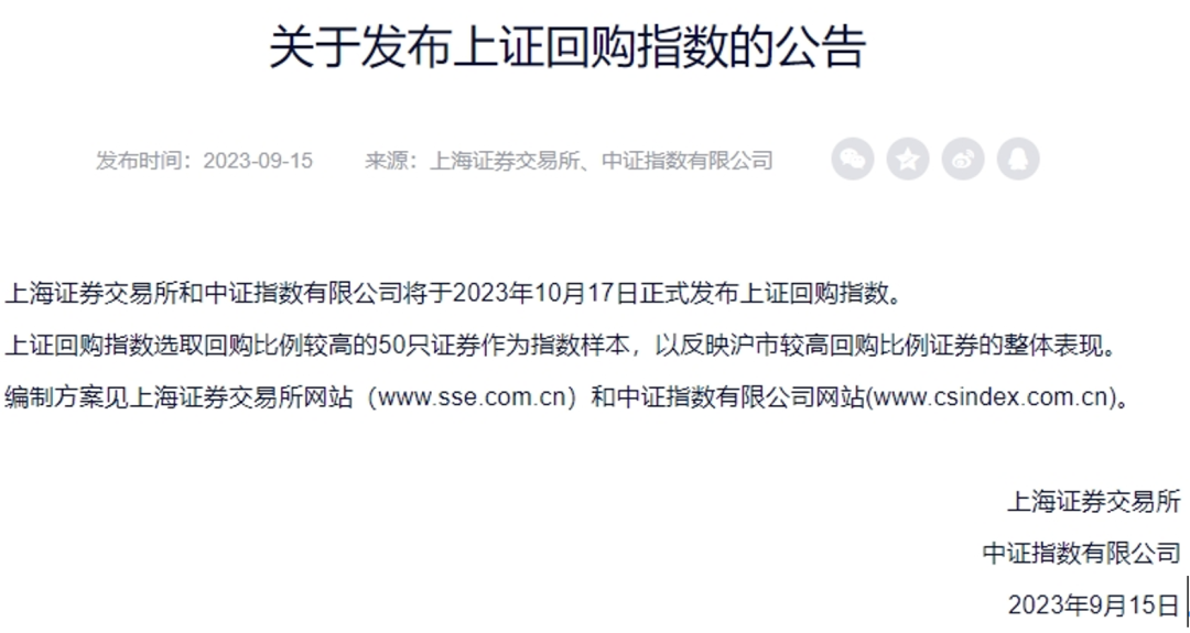 9月15日晚,中证指数公司公告,上证回购指数、中证回购指数、中证回购价值策略指数及中证回购质量策略指数将于10月17日正式发布。