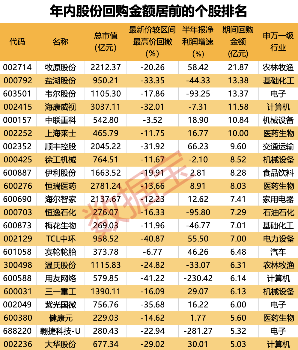 个股来看,牧原股份、盐湖股份、韦尔股份等5股回购金额在10亿元以上,其中牧原股份回购金额超21亿元。号称“猪茅”的牧原股份上半年实现归母净利润-27.79亿元,上年同期亏损66.84亿元,大幅度减亏。公司最新价较年内最高点回撤幅度达20.26%,较2021年2月历史最高点已经大幅回撤52%。