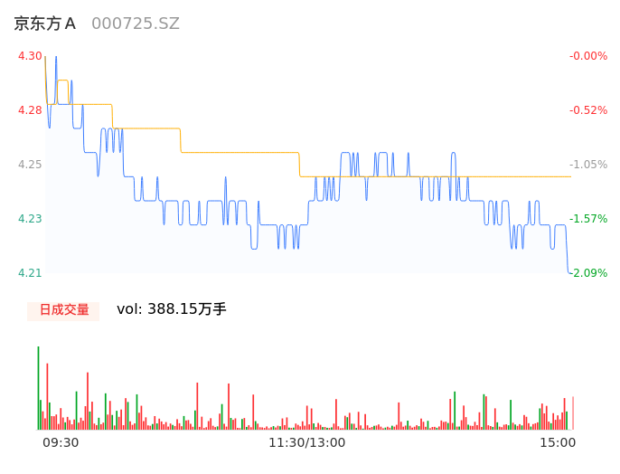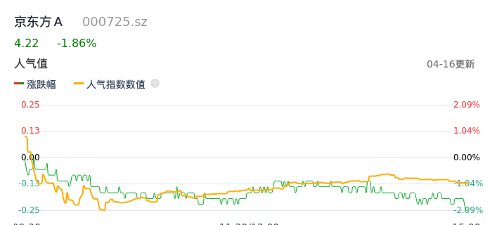 04月16日,京东方A收报4.22,股价涨幅-1.86%,成交金额16.49亿元,换手率1.05%。