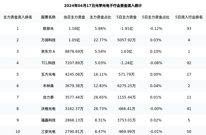 京东方A今日净流入8878.69万元,主力占比5.54%,在行业内排名:3/93;5日净流入1.63亿元,主力占比0.10%,在行业内排名:1/93。