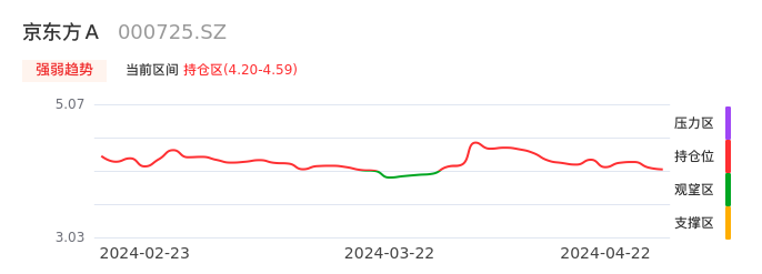 我们来看一下该股的九方特色指标强弱趋势的情况:京东方A自03月28日从观望区上穿到持仓区。股价近期在多头区域回调整理。后续重点关注多空分界点的争夺:4.20元。如未能有效站稳则可能重新回到空头行情。