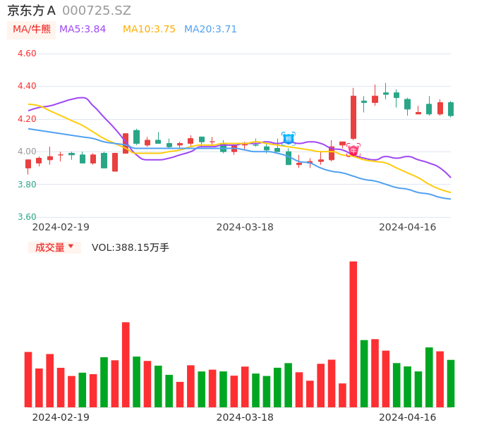 04月16日,京东方A收报4.22,股价涨幅-1.86%,成交金额16.49亿元,换手率1.05%。