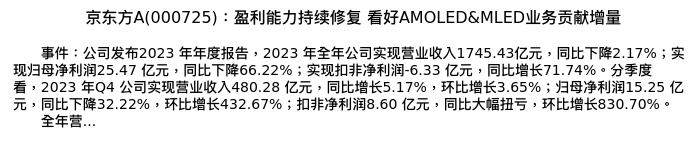 值得注意的是:2024年04月长城证券的分析师,首次发布关于京东方A的研究报告,标题为:京东方A(000725):盈利能力持续修复 看好AMOLED&MLED业务贡献增量。