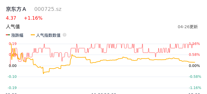 04月26日,京东方A收报4.37,股价涨幅1.16%,成交金额15.60亿元,换手率0.97%。