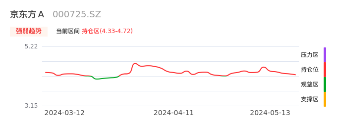 我们来看一下该股的九方特色指标强弱趋势的情况:京东方A自03月28日从观望区上穿到持仓区。股价近期在多头区域回调整理。后续重点关注多空分界点的争夺:4.33元。如未能有效站稳则可能重新回到空头行情。