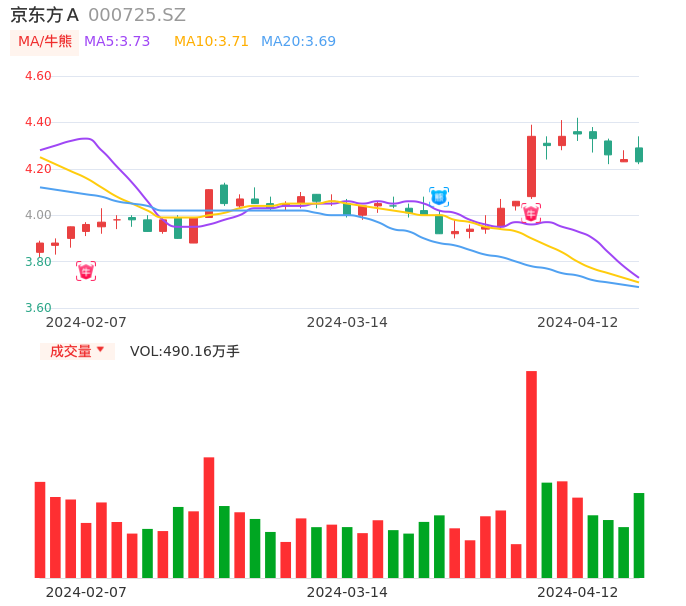 04月12日,京东方A收报4.23,股价涨幅-0.24%,成交金额20.89亿元,换手率1.33%。