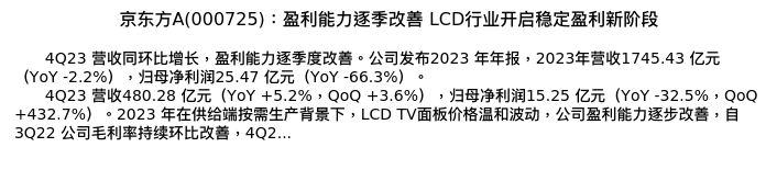 值得注意的是:2024年04月国信证券的分析师,首次发布关于京东方A的研究报告,标题为:京东方A(000725):盈利能力逐季改善 LCD行业开启稳定盈利新阶段。