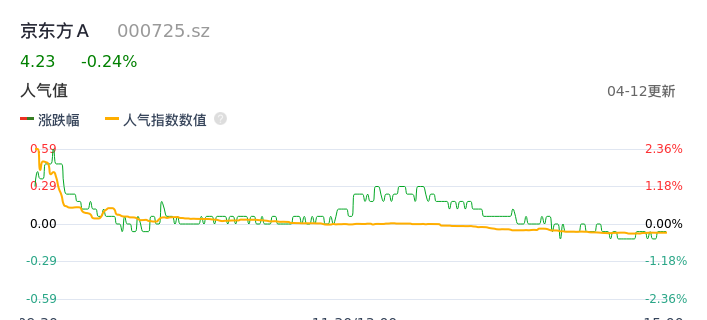 04月12日,京东方A收报4.23,股价涨幅-0.24%,成交金额20.89亿元,换手率1.33%。