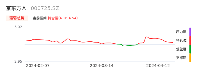 我们来看一下该股的九方特色指标强弱趋势的情况:京东方A自03月28日从观望区上穿到持仓区。股价近期在多头区域回调整理。后续重点关注多空分界点的争夺:4.16元。如未能有效站稳则可能重新回到空头行情。