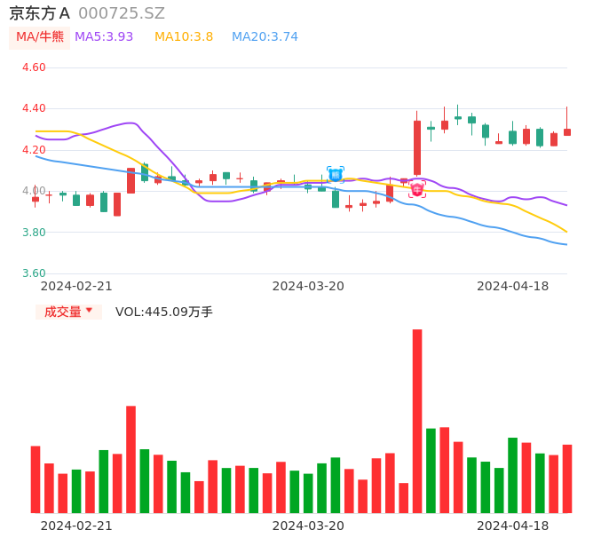 值得注意的是:2024年04月东方财富证券的邹杰分析师,首次发布关于京东方A的研究报告,标题为:京东方A(000725):24Q1盈利大幅改善 供需共振助面板景气向上。